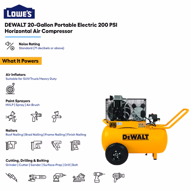 200 Maximum PSI provides 53% longer air tool run time vs 20 gallon 155 PSI belt drive air compressors