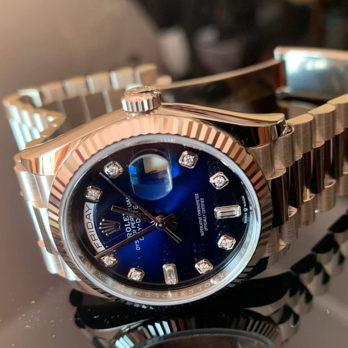 THE OYSTER PERPETUAL DAY-DATE 36 IN 18 CT WHITE GOLD WITH A BLUE OMBRÉ, DIAMOND-SET DIAL, FLUTED BEZEL AND A PRESIDENT BRACELET.