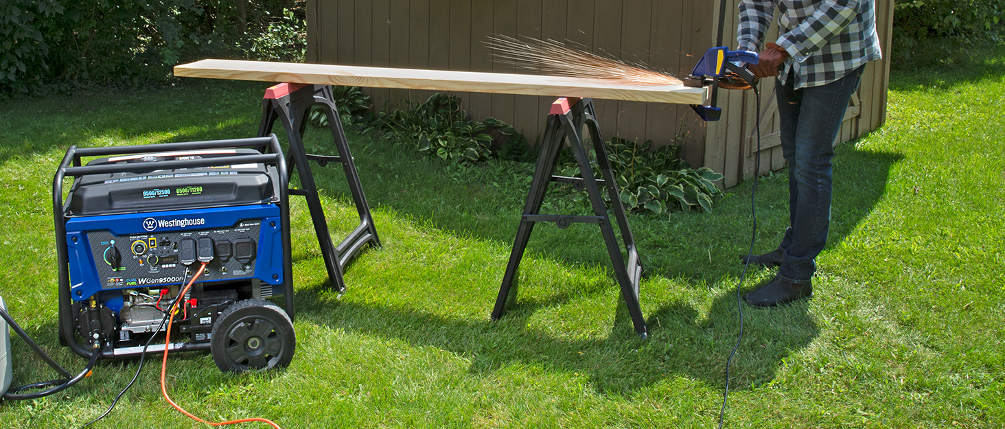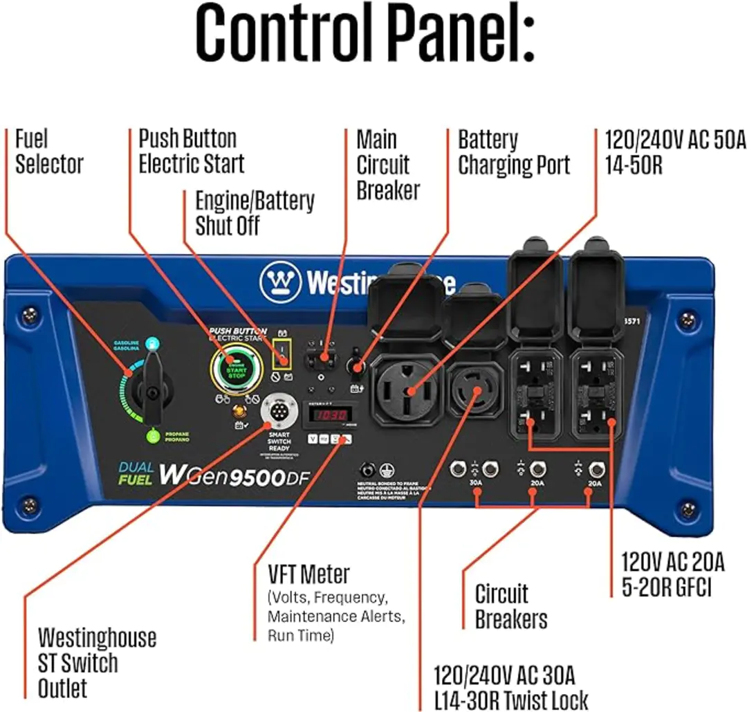 The Westinghouse WGen9500DF Dual Fuel Portable Generator produces up to 12,500 peak watts and 9,500 running watts. The WGen9500DF is a dual fuel generator that operates on gasoline or propane (LPG). The heavy duty 457cc 4-Stroke OHV Westinghouse Engine is constructed of a durable cast iron sleeve and runs for up to 12 hours on a 6.6 gallon (25 L) gas tank, keeping you powered through the day with built-in fuel gauge, automatic low oil shutdown, and GFCI outlets. Push-Button Electric Start makes starting the WGen9500DF effortless while the remote start key fob offers added ease from a distance. Its intuitive control panel spotlights the Transfer Switch Ready L14-30R and larger 14-50R to power your major appliances like the air conditioner, refrigerator, and sump pump as well as any lights or entertainment centers all at the same time with a single cord hookup. VFT Data Center displays volt output, frequency, and lifetime hours to keep you up to date with real-time information and regular maintenance. Conveniently portable with an included set of heavy duty never-flat wheels, handle, and lift bracket, it'll have your house, travel trailer, or jobsite powered in seconds. The WGen9500DF is complete with a 3-Year Limited Warranty and Lifetime Technical Support backed by our nationwide customer service and support network.