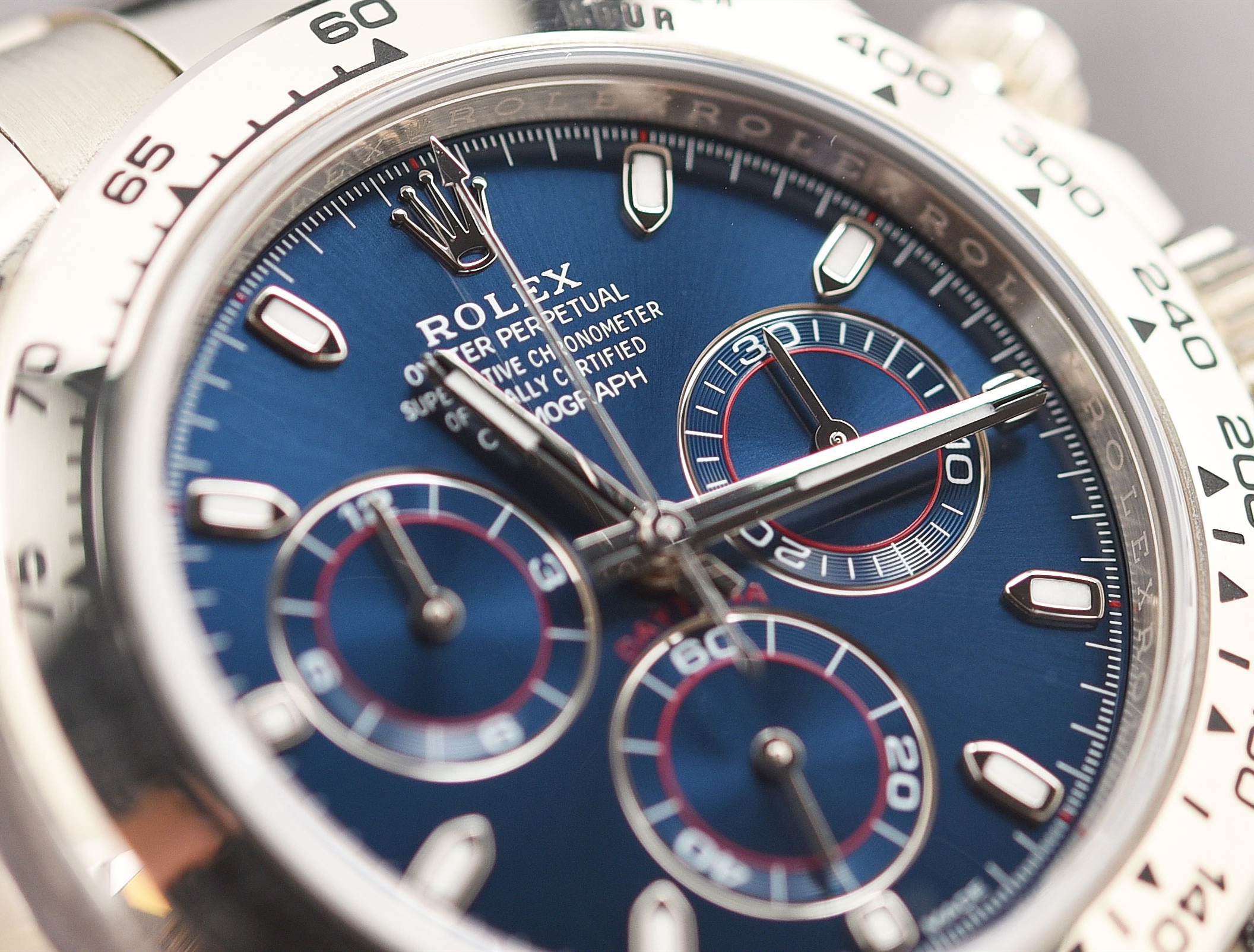 Rolex Daytona Swiss Replica watches are equipped with the new SuperLuminova™ Blue glow luminescent pigment that after sufficient activation by sunlight or artificial light will glow in the dark up to nine hours with uniform luminosity throughout.